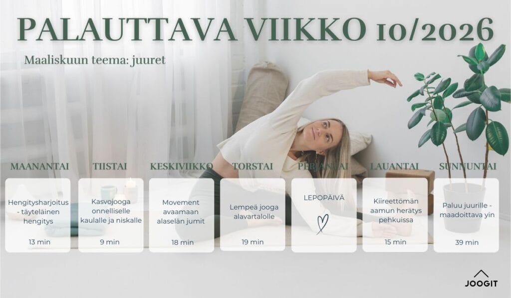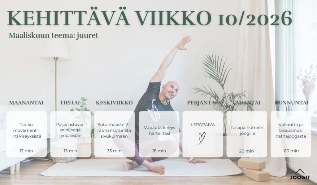 Heippa! Meidän sivuilla käytetään evästeitä, joiden avulla käyttäjäkokemuksesi paranee ja sivut toimivat, kuten kuuluukin. Voit muuttaa evästeasetuksia jälkikäteen footerissa olevan linkin kautta. Kiitos kun olet täällä ja toivottavasti olet pian myös joogamatolla! 🙂
